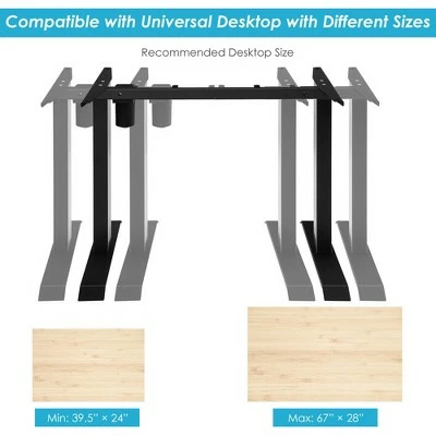 Customize your workstation to your ideal position with this powerful desk frame. You can choose your ideal working mode (sit/stand) and desired height to keep healthy working style. And the easy-to-operate up/down button controller brings a lot of convenience in height adjustment. What’s more, you can install different sizes of desktops (39.5” to 67” in length and 24” to 28” in width) on this lifting desk frame due to its adjustable width design. Made of high grade steel material, the desk frame shows perfect performance in stability, weight capacity and durability.Enjoy your work and leisure time with this standing desk frame. Specification: Color: Black/White. Material: Steel. Overall Dimension: 37.5” – 53.5” X 24” X 26” – 45” (L X W X H). Lifting Speed: 0.8”/s. Nosie: <45db. Net Weight: 41.5 lbs. Weight Capacity: 155 lbs. Package includes:. 1 x Standing Desk Frame. 1 x Instruction.