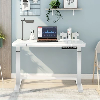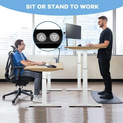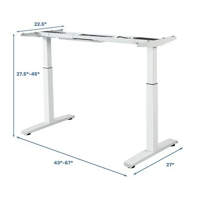 Prolonged sedentary work may lead to chronic fatigue and increase the risk of disease. Our sit stand desk mitigates these problems by allowing you to easily switch between sitting and standing to support your natural posture. Adjustable legs with powerful lifting system will meet all your different height needs. The intelligent push-button controller features 3 programmable memory settings and up/down movement controls. You can easily preset your desired sitting position with the memory function. It not only kills the pain of neck and back, but also enables you to stay awake and alert after long hours of intense work. Constructed with heavy-duty steel, this stand up desk with 4 adjustable foot levellers is very sturdy and stable, which can stand the test of time. The quiet operation will also win the applause from you and never fail your passion for quietness. Moreover, 43” to 67” adjustable width will perfectly match with various tabletop sizes. Don’t hesitate to buy it now!. Specification: Color:WhiteBlack. Material: Steel. Net Weight: 86.5lbs. Overall Dimension: (43-67)”(L) x 27”(W) x (27.5-45)”(H) . Weight Capacity: 220lbs. Noise Level: ≤40db. Package includes: . 1 x Standing Desk Frame. 1 x Instruction Manual.