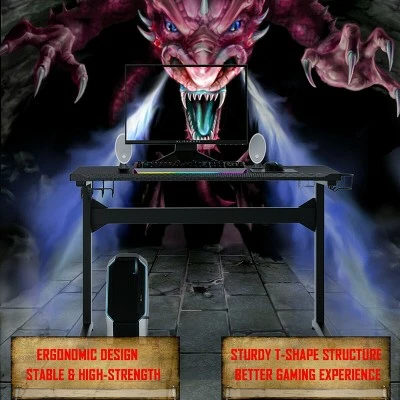 It features large gaming desktop that can withstand 220 lbs of weight, providing ample room for your monitor, PC, laptop, speakers and more.PVC carbon fiber surface is scratch-resistant and easy to clean, reveals excellent performance to allow you to enjoy gaming in enough space. Equipped with a cup holder, a headphone hook and two controller stands, the E-sports table will keep all of your gaming gears organized and be convenient for your daily needs. T-shape frame constructed with steel pipes ensure the stability and durability of the table, accompanying you to enjoy your time in playing games. Specification: Color: as the picture shows. Main material: MDF + steel. Overall dimensions: 48.5”x23.5”x30”(LxWxH). Net weight: 40.5 lbs. Weight capacity :220 lbs. Package includes:. 1 X Gaming Desk. 1 x Instruction.
