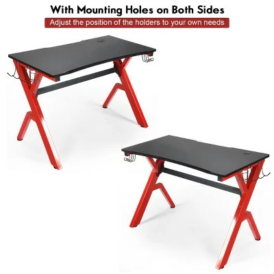 This is our brand new professional gaming desk which is a perfect choice for your enjoyable gaming time! It features large gaming desktop that can withstand 220 lbs of weight, providing ample room for your monitor, PC, laptop, speakers and more.PVC carbon fiber surface is scratch-resistant and easy to clean, reveals excellent performance to allow you to enjoy gaming in enough space. Equipped with a cup holder, a headphone hook and two controller stands, the E-sports table will keep all of your gaming gears organized and be convenient for your daily needs. R-shape frame constructed with steel pipes ensure the stability and durability of the table, accompanying you to enjoy your time in playing games. Good in quality and comfortable for usage, the gaming desk is really worth buying!. Specification: Color: as the picture shows. Main material: MDF + steel. Overall dimensions: 48.5”x23.5”x30”(LxWxH). Net weight: 42 lbs. Weight capacity :220 lbs. Package includes: . 1 X Gaming Desk. 1 x Instruction.