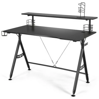 This ergonomic gaming desk with monitor stand is a perfect choice for your home or office. The desktop is wide enough for you to put computer monitors, books, keyboards, plants and other small items on it without crowding. The Y-shaped table legs plus adjustable foot pads are rather sturdy to avoid the table from wobbling or shaking during your gaming time. This gaming table is equipped with a gaming handle rack, headphone hook, cup holder and 2 speaker stands, allowing you to put everything you need at hand and keep your desktop tidy. Additionally, the carbon fiber textured playing surface is smooth, skin-friendly, wear-resistant and easy to clean. This multifunctional desk can be used as a computer desk, study desk, home office desk or gaming table. Specification: Color: Black. Material: MDF, Iron, PVC. Product Dimension: 47” x 26” x 38” (L x W x H) (L x W x H). Net Weight: 43.5 lbs. Weight Capacity: 132 lbs. Package Includes:. 1 X Gaming Desk. 1 X Cup Holder. 1 X Game Handle Rack. 1 X Headphone Hook. 2 X Speaker Stand. 1 X Instruction.