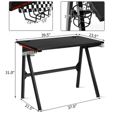 Our gaming desk is the best choice for your exciting game playing!. The gaming desk is designed with heavy-duty structure for extra stability with high load capacity. Wide desktop provides a large space for holding all your gaming gear, including keyboard, cup, PC, magazines. And it is water-proof and more durable for better use. Specially comes with a cup holder, a headphone hook and 2 cable management grommets, the desk can perfectly keep your necessities in order and make it easier to get. Ergonomic construction and size offer a more comfortable experience without fatigue. Start enjoying your wonderful gaming time with such a functional desk! . Specification: Color: Black. Material: MDF, Metal. Size: 39.5” x 23.5” x 31” (LxWxH) . Net Weight: 44 lbs. Weight Capacity: 135 lbs. Package includes: . 1 x Gaming Desk.