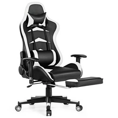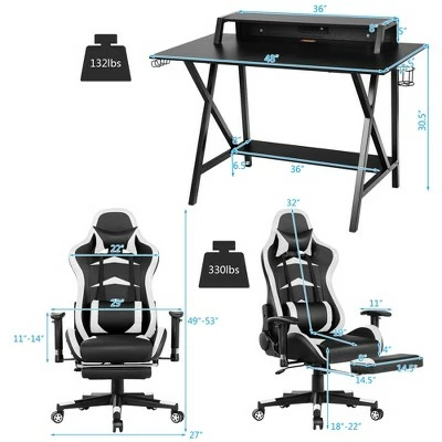 Our gaming desk and chair set is designed to provide you with the perfect gaming experience!Crafted of high-quality materials, our gaming desk and chair set is sturdy and durable for long-term use. The monitor shelf adds more space for the computer monitor and keeps it level with the eyes to relieve cervical and neck pain. With the 48” x 23.5” desktop, you have a spacious area to keep your game equipment and other supplies. Along with the desk, this gaming chair is equipped with adjustable backrest, which allows you to find the best angle for gaming, working and napping. Skin-friendly PVC leather and high-density sponge offer you a soft and comfortable sitting feeling. Specification: Color: Black(Desk)+White(Chair). Table Material: MDF + Steel. Chair Material: PVC + Iron. Desk Size: 48” x 23.5” x 35.5” (L x W x H). Chair Size: 29” x 27” x(49”-53”)(L x W x H). Desk Weight: 45.5 lbs. Chair Weight: 44lbs. Weight capacity of the desk: 132lbs. Weight capacity of the chair: 330lbs. Package included:. 1 X Gaming Desk. 1 X Gaming Chair. 2 x Manual.