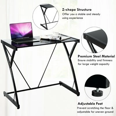 This is our brand-new and elegant computer desk, which will be a perfect addition to your home or office furniture. Combining the Z-shape frame with iron legs, this table provides you with years of sturdy and reliable use. Made of superior tempered glass with heat-resistant and wear-resistant features, this tabletop not only ensures aesthetics but also offers great load-bearing capacity. With its large full-size workstation, the writing table provides you with a convenient place to work or store items. Equipped with adjustable footpads, this laptop desk is stable without shaking even on uneven ground. We are sure that this desk will bring convenience and happiness to your life. So, what are you waiting for? Order one now!. Specification: Color: black. Main material: tempered glass, iron. Overall dimension: 31.5″Ă—20″Ă—28″. Net weight: 18.5lbs. Weight capacity: 44lbs. . Package includes:. 1Ă—computer desk. 1Ă—insturction.