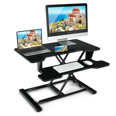 If you are too tired to sit while working for a long time, why not try this standing desk riser? It is designed to assist those who are going through back muscle fatigue and eager to find a comfortable posture to keep their body relaxed during working. Professional pneumatic design makes for an instant as well as smooth height adjustment. The wide enough working surface measuring 32” x 17.5” is compatible for dual monitors. Sturdy metal frame and rectangular base leave you no worry about its stability. Plus, it can support up to 33 lbs. Take this ergonomic standing desk to your home office and enjoy maximum benefits of increased productivity. Specification: Color: Black / White. Material: MDF, Metal. Net Weight: 28.7 lbs. Dimension of Tabletop: 32” x 17.5” (L x W). Dimension of Keyboard Tray: 30” x 10” (L x W). Full Dimension: 32” x 24” x 20.5” (L x W x H). Adjustable Range: 8” – 20.5”. Weight Capacity of Desktop: 22 lbs. Weight Capacity of Keyboard Tray: 11 lbs. Package includes:. 1 x Standing Desk. 1 x Instruction .