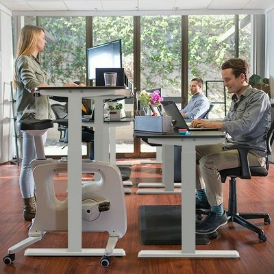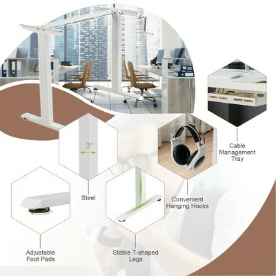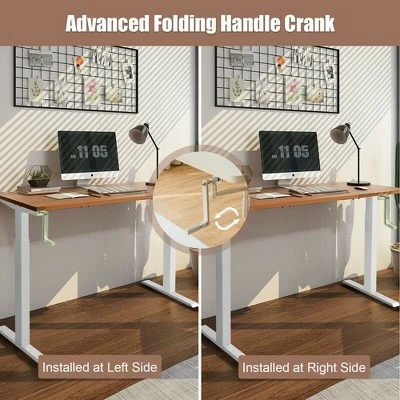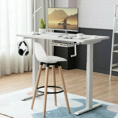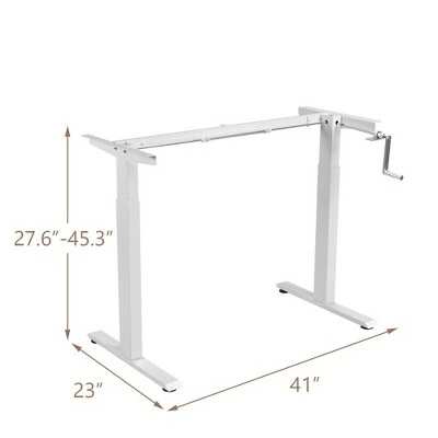 Are you looking for a height adjustable desk frame to pair with your single tabletop? Our sit stand desk frame will be your ideal choice! With a manual hand crank system, this desk frame lets you switch from sitting mode to standing mode to work comfortably throughout the day. You can adjust the height of the desk frame from 27.6” to 45.3” to promote better posture and increase productivity. For outstanding load bearing and stability, the framework uses a reinforced steel structure to ensure long service time. What’s more, 48” board or 55” board can be installed on the frame for versatile use and extra convenience. Enhance your work experience with this ergonomic standing workstation base!Assembly Video:https://www.youtube.com/watch?v=aL7hw0kKVzc Specification: Color: White. Material: Steel. Overall Dimension: 41” X 23” X 27.6” – 45.3” (L X W X H). Net Weight: 36 lbs. Weight Capacity: 110 lbs. Package includes:. 1 x Standing Desk Frame. 1 x Instruction.