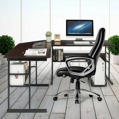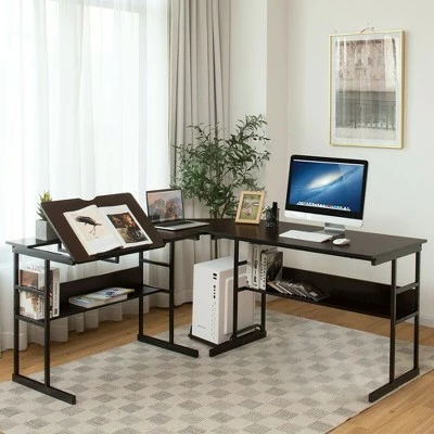 Our computer desk is ideal for your home and office!This corner table fits snugly in a corner to save much space. The L-shape desk can be divided into two separate tables to meet your various needs. Good classification for working and relaxing area makes this desk become the main activity center of your home. The tilted panel can be adjusted to a proper angle, which will protect your eyesight and actively cooperate with you to work. The flexible CPU stand could be placed freely according to your own demand. 2 open shelves offer plenty of storage room for putting books, files and other office essentials. Specification: Color: Espresso / Rustic Brown / Natural / Walnut. Material: Metal, Engineered Wood. Product Dimension: 67” x 59” x 29.5” (L x W x H). Net Weight: 84 lbs. Weight Capacity: 450 lbs. Package Includes:. 1 x L-Shaped Computer Desk. 1 x CPU Stand. 1 x Instruction.