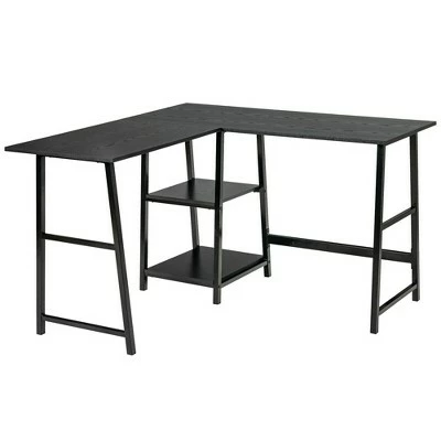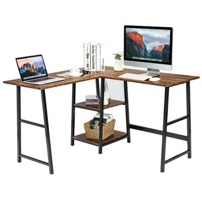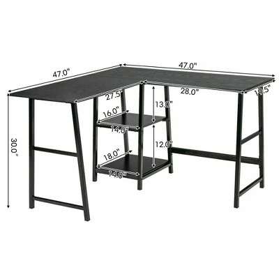 Are you looking for a versatile L-shaped office desk which keeps your work space tidy and improves your working efficiency? Our L-shaped desk with shelves will be your ideal choice! The large tabletop and detachable shelf maximize the satisfaction of your different storage needs and create a comfortable working environment for you. Supported by heavy duty steel construction, our computer desk is sturdy enough to support all kinds of belongings. Thanks to the additional cross bar, you can relax your legs and feet in a comfortable position. With a compact L shaped frame and minimalist style, this study workstation can be put in limited places. It is suitable for reading, working, playing games, etc. Get more enjoyment from this computer desk. Specification: Color: Black/Rustic Brown. Material: Steel, Engineering Wood. Overall Dimension: 47” x 47” x 30” (L x W x H). Dimension of the Upper Shelf: 18” x 14” x 12” (L x W x H). Dimension of the lower Shelf: 16” x 14” x 13”(L x W x H). Net Weight: 47 lbs. Weight Capacity: 110 lbs. Package Includes:. 1 x L-shaped Computer Desk. 1 x Instruction.