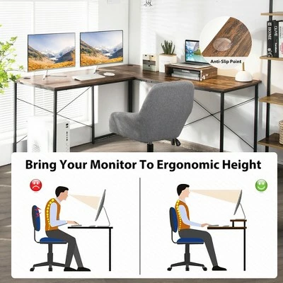 Are you still frustrated by the limited working space? Let our reversible L-shaped computer desk save you the bother. Because of sturdy steel construction, the computer desk has great weight capacity of 253 lbs. And it also has adjustable foot pads for better stability. Considering that customers has different house types, the writing desk is designed to be reversible. You can assemble it into a L-shaped desk or a long desk. The complete workstation is so spacious that 2 people can work at the same time. Besides, there is a movable and non-slip monitor display shelf on the desk which keeps your laptop at appropriate sight level to help you sit in a correct posture. In this way, you do not have to work with your head down for hours. Specification: Color: Natural / Rustic Brown / Brown / Black / Grey. Material: Engineered Wood, Steel. Dimension of L-Shaped Desk: 59” x 59” x 29” (L x W x H). Dimension of Straight Desk: 95” x 24” x 29” (L x W x H). Dimension of Monitor Display Shelf: 16” x 9.5” x 4” (L x W x H). Weight Capacity of Desktop: 220 lbs. Weight Capacity of Monitor Display Shelf: 33 lbs. Overall Weight Capacity: 253 lbs. Net Weight: 52.5 lbs. Package Includes:. 1 x L-Shaped Computer Desk. 1 x User Guide.