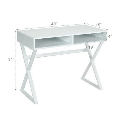 Our modern multifunction desk has a white MDF board desktop with iron side columns and side crossing. The material is durable and can accompany you for a long time. At the same time, the structure is strong. Screw connection and X-shaped legs design make the table stable. Most importantly, it is a versatile desk. You can use it not only as your desk for your work or study, but also as your dressing table to help you make up and store cosmetics. With built-in 2 storage compartments to meet your storage needs. Do not hesitate to buy it now! Specification: Color: White. Material: P2 MDF and Iron. Overall Dimension:40”(L) X 19”(W) X 31”(H). Weight Capacity: 120lbs. Package includes:. 1 X Table. 1 X Instruction. Warning: The mirror is not included. Assembly Video:https://youtu.be/hpqrFP_uOhA