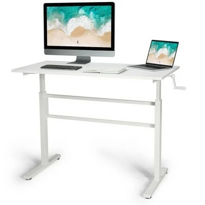 Away from the harm of sitting for a long time, and make office life more comfortable! Our sit to stand up desk is a good choice for both high efficiency and comfortable experience.Crafted of selected MDF and heavy duty steel frame, this standing table is firm, antirust and durable. The ergonomic desk can be easily adjusted from sitting to standing (29.5”-44.5”) with a foldable crank handle. Its customized height design will offer neck comfort and posture flexibility, improving your attention and productivity. With simple and elegant style, it is ideal for your bedroom, study room, office, etc. Specification: Color: White. Material: MDF + Steel. Product Dimension: 47” x 23.5” x 29.5”-44.5” (L x W x H). Net Weight: 50 lbs. Weight Capacity: 100 lbs. Package Includes:. 1 x Height Adjustable Sit to Stand Desk. 1 x Crank. 1 x Instruction.