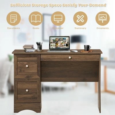 This computer desk is perfect furniture for your home or office and will provide you with great convenience. Constructed by high quality engineered wood, our charming study desk enjoys stable structure and great stability. And it also equipped with one long drawer and two side drawers, providing you with ample storage space. The smooth and large tabletop allows you to work and play with comfort. You can also use it as writing desk for writing or reading. Moreover, it’s super easy to clean and assemble. Indeed, you deserve such a wonderful study table and start your high efficiency working time.. Specification: Color: Brown. Material: P2 Engineered wood . Product Dimensions: 44”(L) x 19.5”(D) x 29”(H). Net Weight: 65.5 LBS. Package includes:. 1 x Computer Desk. 1 x Assembly Instruction.