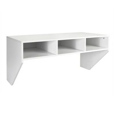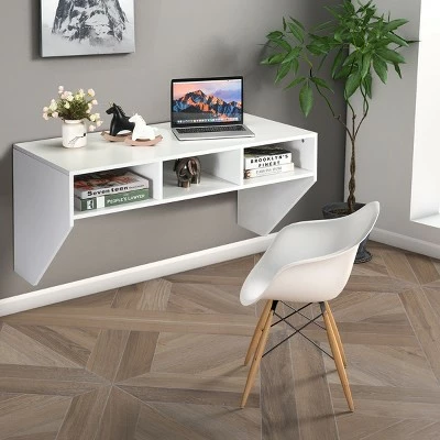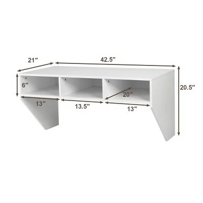 Improve your space utilization with our wall-mounted desk in your home! With stable structure and large weight capacity, the desk is ideal to place your computer and other things. Besides, there are also three large capacity compartments below desktop to offer your other storage space for your sundries. Designed in modern and concise style, the desk is perfect to suit for any kind of decoration of home, office, living room, kitchen or bedroom. What’s more, this set not only provides functional storage but also doesn’t take up your valuable floor space. Therefore, the space around the desk won’t clean by bending or crouching to save effort. And the two legs of desk are in tilting design to prevent bumping from in to them. After receiving the parcel, the desk is easy to assemble according to the instructions by yourself. . Specification: Color: White. Material: MDF. Product Size: 42.5”x21”X20.5”(L x W x H) . Weight: 42lbs. Weight Capacity: 44lbs. Package include: . 1 x Wall-mounted Desk. 1 x Accessory Bag. 1 x Instructions. .