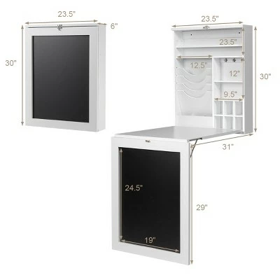 This is our brand new wall-mounted table, which can not only be used as a working surface and storage area anywhere you need it but also can be a blackboard. It includes a board eraser, bill organizers, fix shelves, 2 adjustable shelves and 3 hooks. Made of MDF, it is stable and sturdy, allowing long-term use. Enough shelves are designed to store essential items, books, magazines, etc. Small lattice can store more items, making your desktop more organized. In addition, it is easy to mount onto any wall. Don’t hesitate to buy it!. Specification: Color: white. Material: MDF. Weight: 39.6lbs. Maximum weight for table top: 220lbs. Maximum weight for shelving: 50lbs. Product expansion size: 31”X23.5”X60”(LXWXH). Product folding size: 23.5”X6”X30.0”(LXWXH). The size of blackboard: 19”X24.5”(LXW). Please refer to the picture to more size information. Package included:. 1 x wall mounted folding table. 1 x board eraser. .