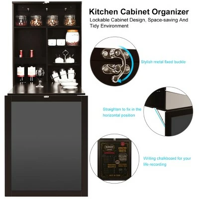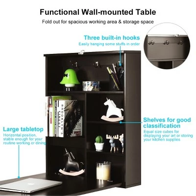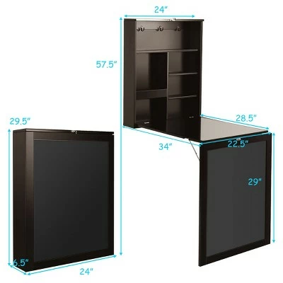 The wall mounted desk folds out to provide ample space for working and folds up to serve as the cabinet to keep tidy, an ideal space-saving solution for any homeowner looking for storing essential items to reduce clutter and optimize your personal space. Exquisite smooth provides a handy working surface and access to storage compartments when open. Let’s make the most of your existing space with this stylish and affordable fold-out convertible desk! . Specification: Color: Brown. Material: P2 standard MDF. Overall Dimensions: 34 x 24 x57.5 Inches (L x W x H). Folded Dimensions: 24 x 6.5 x 29.5 Inches (L x W x H) . Net Weight: 32.4 lbs. Weight capacity of the unfolded desk top :44lbs. Weight capacity of each cube:4.4lbs. Package includes:. 1 X Fold out Wall Mount Desk. 1 X User Guide.