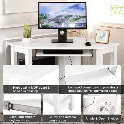 This is our new corner computer desk which is a compact and functional item. Be made of wood ,it is sturdy and durable . Corner design help you maximize your limited floor area. It has a large opening drawer to store your keyboard, And two opening storage space underneath for host computer , miniprinter, books ,CDs and so on. Can be used as study desk, office desk, home office desk workstation and computer desk. This desk compliments any room and is a great addition to any home office Specification: Color:White. Material:Particle Board and hollow slab. Overall Dimensions:47.5”L X 24.0”W X 30.5” H. Net weight:45.98lbs. Weigh capacity:88lbs. Package includes:. 1XDesk. 1XInstruction.