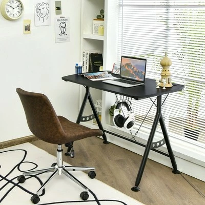 This ergonomic gaming desk is a perfect gaming partner for you! Our gaming desk provides you with a spacious gaming or working area and you can put computer monitors, books, keyboards, plants and other small items on it without crowding. More, the carbon fiber textured playing surface is smooth, skin-friendly, wear-resistant and easy to clean. The Y-shaped table legs, supportive crossed rods and adjustable foot pads make the table super stable without wobbling or shaking during your gaming time. Equipped with a headphone hook and cup holder, the gaming desk allows you to put everything you need at hand and keep your desktop tidy. You can use this multifunctional desk not only as a gaming table, but also as a study desk or home office computer desk. Specification: Color: Black. Material: MDF, Iron, PVC. Product Dimension: 41.5” x 23.5” x 30” (L x W x H). Net Weight: 30 lbs. Weight Capacity: 132 lbs. Package Includes:. 1 X Gaming Desk. 1 X Cup Holder. 1 X Headphone Hook. 1 X Instruction.