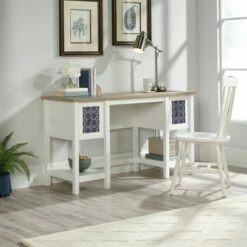 Create a workspace in your home that inspires you by adding this Cottage Road Desk from Sauder. Made with a sturdy and durable wood frame, this desk features a rectangular top that’s lightly stained to show off the natural grain of the wood. The base is painted white for a clean and polished look, while the two drawers on either side have mosaic-style prints on the front in navy and white for a bold accent. Complete with two slatted lower shelves for ample storage space, this white desk with drawers is the perfect place for a day’s work or crafting on the weekend.