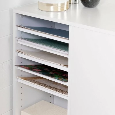- One module includes: (front) 3 open storage spaces, defined by 2 shelves; (side) 5 angled open storage spaces with adjustable shelves designed especially for holding 12” x 12” paper