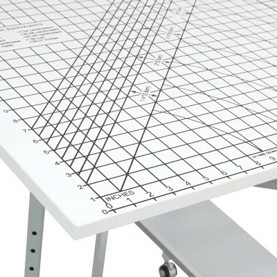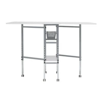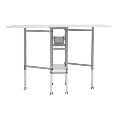 Folding, Height Adjustable Quilting, Fabric Cutting Table with Grid Top and Storage by Sew Ready allows you to set the height of the large, expanding top to the perfect height for you to alleviate back pain. The sewing grid includes inches, centimeters, angles, radial lines for your quilting or sewing projects. The storage bins under the center top keep your tools available but off the top for more work space. The casters make it easy to move aside for more space in your sewing studio.