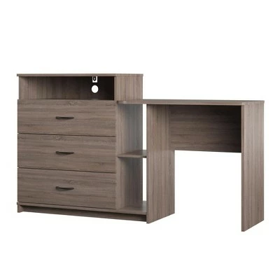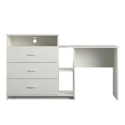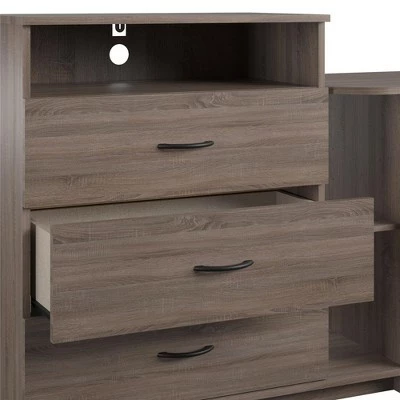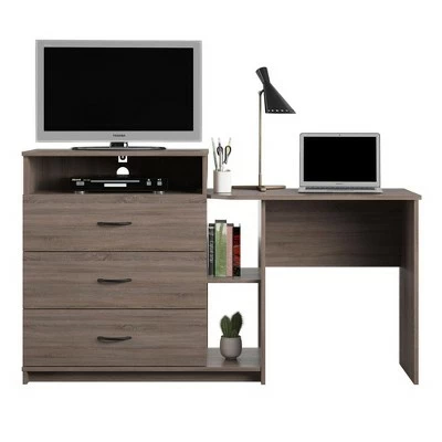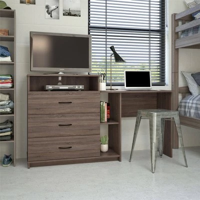 Add a multi-functional piece to your dorm room with the Room & Joy Devlin Media Dresser and Desk. The finish on the laminated particleboard gives this item an elegant look for an affordable price. This item features a TV Stand, 3 Drawer Dresser, small Bookcase, and Computer Desk all in one. The TV Stand can accommodate a TV up to a 39” or 40 lbs. and offers an open cubby below with wire cutout in the back for your cable box or gaming system. The 3 Dresser drawers will hold folded jeans, t-shirts, and extra blankets. Each drawer has durable metal slides and is finished inside with a linen look paper so clothes don’t snag on raw edges. Finish your homework and papers on the Desk on the right side of this versatile item. The desktop can hold your laptop, pens and pencils, and textbooks. Between the Dresser and Desk is a small Bookcase with 1 adjustable and 1 fixed shelf to hold your textbooks and favorite reading books. A wall anchor is included with this item to properly secure to the wall and prevent tipping injuries. The Media Dresser and Desk ships flat to your door and requires assembly. Two adults are recommended to assemble. Once assembled, the Media Dresser and Desk measures to be 34.69”H x 59.21”W x 17.72”D.