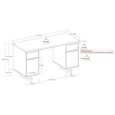 - Weight capacities: Top surface 200 lbs., top drawers 10 lbs. each, shelves 25 lbs. each