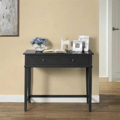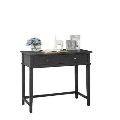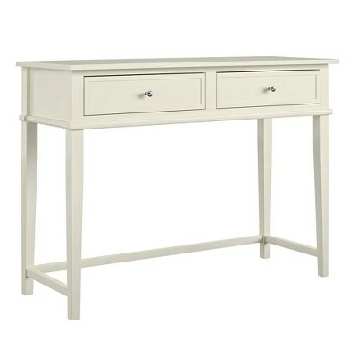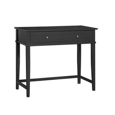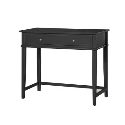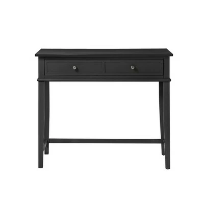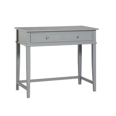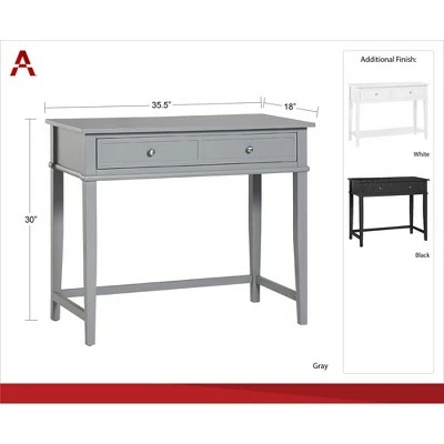 Get all the workspace and storage you need to finish paperwork on the Room & Joy Durham Writing Desk. This sturdy desk is made of painted MDF and solid wood legs for a sturdy build that will last. The decorative molding and tapered legs give this Desk an elegant look for an instant upgrade for your living room or home office. The desktop can accommodate your laptop, notebook, and family photos. The drawer features silver knobs and a double framed front for the look of 2 drawers and is spacious enough to store away your stationary, office supplies, and extra paper. Complete your room with the entire Durham collection for a coordinated look (each sold separately). The Writing Desk ships flat to your door and requires assembly upon opening. Two adults are recommended to assemble. Once assembled, the Desk measures to be 30″H x 35.5″W x 18″D.