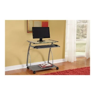 Set up a compact, mobile workstation with this 26.5-inch Easy2Go metal and glass computer cart. Provide a sturdy mount for a desktop system with this mobile computer cart. The durable tabletop, slide-out keyboard tray, and bottom shelf offer convenient organization for devices and peripherals, and the sleek glass and metal construction exudes a modern style that complements home or office decor. This Easy2Go computer cart has a compact design and four casters for easy positioning in tight spaces. Compact computer desk with a minimal working footprint. Comes in silver/transparent color and is made of glass. Overall dimensions: 29.5″H x 26.5″W x 19.5″D. Base is made of metal for durability and strength. Rectangular desk features contemporary furnishing style. Bottom shelf holds peripherals and office supplies. Designed with keyboard tray for adding more space to your desk space. Assembly required. 1-year manufacturer limited warranty. Easy2Go Metal and Glass Computer Cart for Mobility. Take your computer to the work with this Easy2Go metal and glass computer cart. Its compact design fits smaller spaces for additional work areas. With this Easy2Go metal and glass computer cart, your staff can move their computers and other essential work tools to where the work is instead of bringing the work to them. This is a great addition in a medical office, a dental clinic or another businesses where customers need to remain in a certain area. Designed for Functionality. Featuring a bottom shelf for accessories and storage and a slide out keyboard tray, this cart moves from place to place without a lot of effort. The sleek metal and glass design complements most decors as it moves from one office to another in your company. Four casters on the bottom of the cart keeps it balanced and swiftly moving, and when it arrives, your staff can put it together quickly and easily with tools commonly found around the office. Sold as 1 Each.