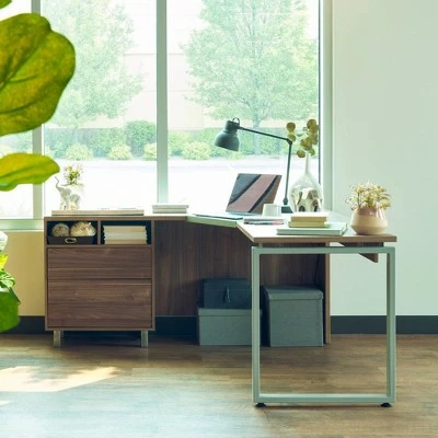 - Set includes an L shaped desk with two closed drawers and two exposed shelves