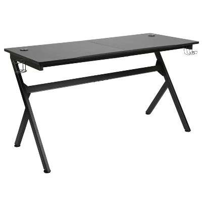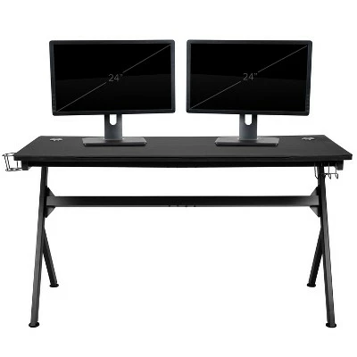 Whether you’re on a quest, building cities from the ground up or taking out zombies a great gaming desk is a must have. This black gamer workstation features a headphone holder and cupholder to free up your hands and 2 cable management holes to keep you organized. This extra large computer table is specifically designed to hold your gear and has space for your gaming console and controllers, laptop and other necessities such as dual monitors, a keyboard and a gaming mouse. This contemporary home computer desk has a removable padded top so the whole surface acts as a mouse pad. The ultra strong powder coated steel frame holds up to 110 lbs weight capacity. This computer desk for gaming gives you generous leg room and ample space for a desktop tower or a 6 can mini-fridge for those marathon gaming sessions. Self-leveling floor glides will ensure your platform stays stable. This gaming station desk assembles in less than 30 minutes with the included tools. A premium home office PC table is great for all gamers and will be right at home in your home office, bedroom, dorm room, or gaming room. Pair this gaming desk with one of our gaming racing office ergonomic computer PC adjustable swivel chairs for the ultimate experience. Additional Features: 2 Cable Management Holes to bundle cords for a neat appearance, Black Powder Coated Steel Frame holds up to 110 lbs. weight capacity, Self-Leveling Floor Glides keep your platform stable, Computer Table Gaming Desk ideal for home office, bedroom, dorm room, call centers, mancaves and she sheds, Pair this gaming desk with one of our gaming racing office ergonomic computer PC adjustable swivel chairs for the ultimate experience.