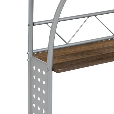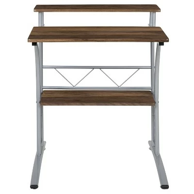 Streamline your home office with this on-trend mixed media computer desk that definitely makes a statement. Offering an efficient workstation that fits well in small spaces, this office desk with storage shelves is ideal for apartment living or dorm rooms. The contrasting silver perforated design frame pairs beautifully with the wood grain laminate shelving for a modern look. The generous desk surface boasts a smooth rustic walnut finish with a raised top shelf for your monitor or keepsakes and a lower bottom shelf for your hard-drive and other supplies. The two shelf desk has a powder coated steel frame for long-lasting durability. Self-leveling floor glides keep your desk from wobbling on uneven floor surfaces and protect your floors by sliding smoothly when you need to move the desk. The compact open storage shelf desk has a modern design that works well for both studying and daily tasks. Pair this home office computer desk with one of our executive swivel office chairs to complet your set-up. Additional Features: Powder Coated Frame Finish for long-lasting use, Self-Leveling Floor Glides give you a stable work surface and protect hard flooring surfaces, 2 shelf computer desk perfect for smaller spaces such as home offices, dorm rooms and apartment living
