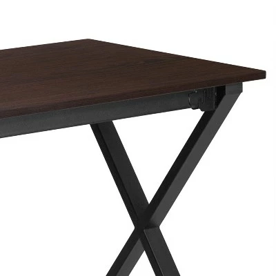 Relaxed design meets simplicity of function in this large surface writing desk that provides ample space for your laptop and writing materials. This walnut computer desk with black metal frame provides a great option for managing daily household bills or for casual computer usage. The simple design of this desk allows it to easily fit into any work space. Black crisscross legs highlight the desk along with its dark walnut finished top. This desk offers a no fuss option for those seeking a clean-cut looking desk for completing various projects. As an occasional use desk, add real or faux books in one corner, a miniature plant and a family portrait in a fancy frame to make it look appealing while not in use. Additional Features: Black Powder Coated Metal Frame, Self-Leveling Floor Glides
