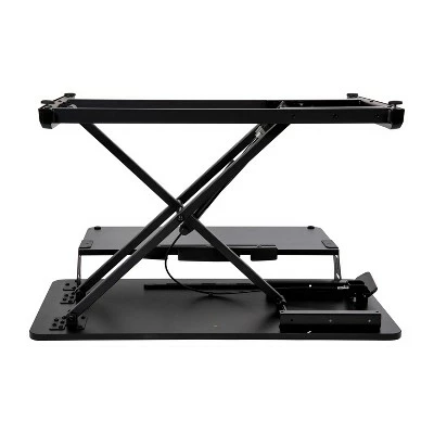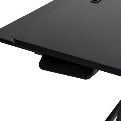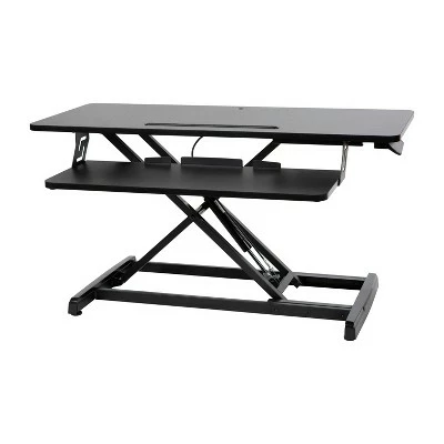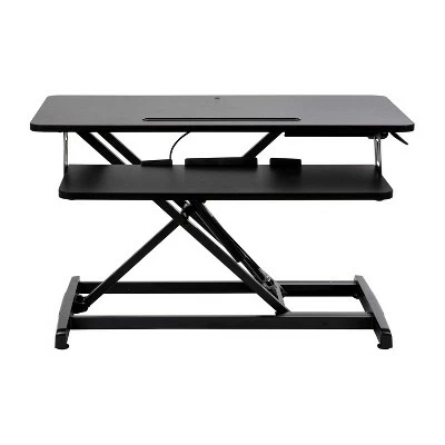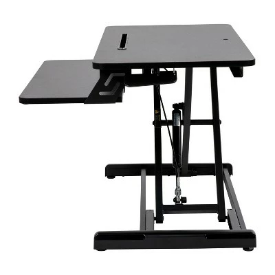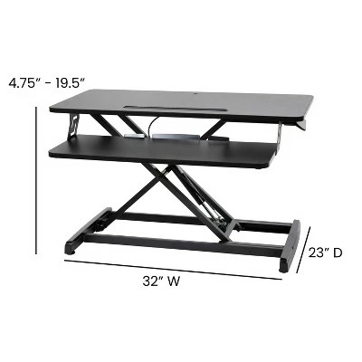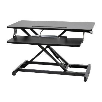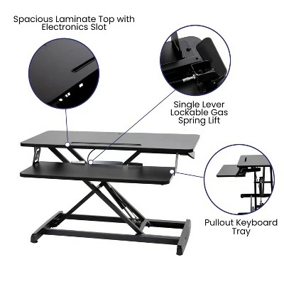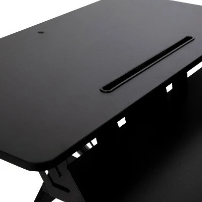 Take a break from the everyday and gain some health benefits with this adjustable height desk riser. Going from a seated position to standing gets the body moving to help burn calories, improve mental focus and boost productivity. The generous work surface of this 32 inch sit to stand desk riser holds up to 28 pounds and will accommodate everything from a laptop to a dual monitor desktop setup. The built-in desktop slot has multiple uses including holding your tablet or phone. Sitting for long periods is becoming more common as the workday grows longer. This adjustable desk riser adapts from 4.75″ to 19.5″ with a single lever giving you the option to sit or stand depending on the task at hand. Standing helps strengthen leg muscles, improves your balance and promotes healthy blood flow. A lockable gas spring allows you to stop the ascent or descent of the desk at any time while the pullout keyboard tray keeps a staggered height between the keyboard and monitor. Never worry about the surface of your traditional desktop, nonskid rubber pads protect your desk’s surface and prohibit the unit from sliding. Have your new adjustable riser ready to go in under 10 minutes with the illustrated instructions. Use a dry cloth to keep your convertible desk riser looking good as new. Additional Features: Single Lever Lockable Gas Spring for multiple height selections, Protective Rubber Glides keep your desktop unmarred and the unit in place, Clean with a Dry Cloth to maintain good looks, Illustrated Step-By-Step Instructions Included, Convertible desk riser ideal for desk use as well as above average height work surfaces