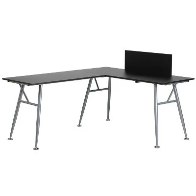 If space is not an issue for you, the work area gained with an l-shaped computer desk is priceless. Accommodate your monitor, laptop, books, office supplies and other necessities while maintaining ample space for writing. This desk features a spacious black laminate top with a privacy board and an attractively styled metal frame making it an ideal pick for any modern space. Investing in a desk for your home makes working from home or managing household bills and paperwork a nicer experience. Make this high-quality desk a center piece in your workspace for an ultra-modern design. Additional Features: Self-Leveling Floor Glides, Components:, Overall Diagonal Width: 89.5″, Desk: 43.5″W x 23.75″D x 29.5″H, Desk: 59″W x 25″D x 29.5″H