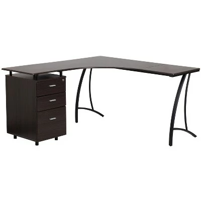 If space is not an issue for you, the work area gained with an l-shaped computer desk is priceless. Accommodate your monitor, laptop, books, office supplies and other necessities while maintaining ample space for writing. This l-shaped computer desk is a great option when needing to fill a larger workspace and features a box/box/file pedestal to store files and other materials. Top drawer has a locking system that locks all three drawers to keep private information safe. You can place on either corner of a room or come off the wall to add an open concept feel, where you can access the desk from either side. Modernize your work area with a modern computer desk that won’t make you feel hemmed in. Additional Features: Pedestal Size: 15.75″W x 19.5″D x 27″H, Box Drawer Size (2): 12.5″W x 15″D x 3.5″H, File Drawer Size (1): 12.5″W x 15″D x 12″H, Powder Coated Frame Finish with Self-Leveling Floor Glides, Components: Desks (2): 20″W x 19.75″D x 29.75″H; Corner Connector: 55.25″W x 42″D