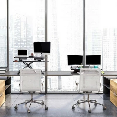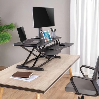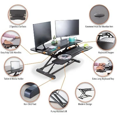 - EASY HEIGHT ADJUSTMENTS: The pump assisted lift and easy grip side handles let you smoothly and securely raise your desk converter to your perfect ergonomic height