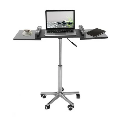 The Techni Mobili Folding Table Laptop Cart saves space while providing the laptop or writing setup you need. It features a chromed steel frame that adjusts from 26 up to 35.75 inches in height. The unfolded panels add 14 inches of workspace. Fits laptops of up to 16.5 inches wide. Folded Panels each have a 22lbs Weight Capacity and middle desktop holds up to 80LBS. Panels are made of MDF panels with a moisture laminate surface atop a powder-coated steel frame. Color: Graphite.