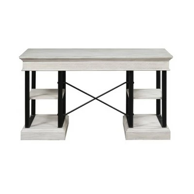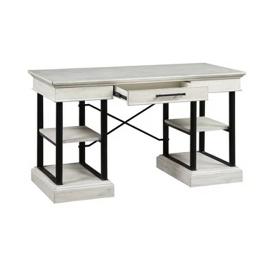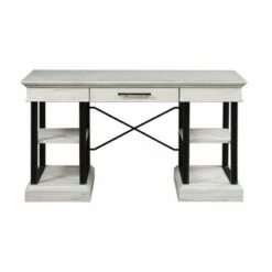 An impressive and bold design, this striking one drawer Desk has everything you have been looking for and more. Double dark metal legs rise up from the tiered bases on either side, nestling open shelves and supporting the spacious top, all of which are finished in our Gabby Hazy White for a beautiful contrast. For your home office, den or anywhere in between, this Desk will be a standout as well as a wonderful place from which to work.