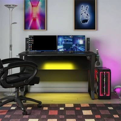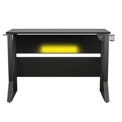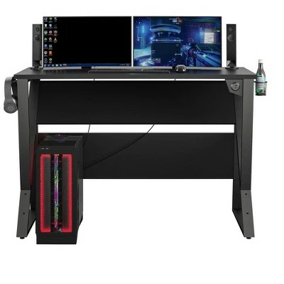 Go from n00b to true gamer and have a place for your entire setup with the NTense Genesis Gaming Desk. Made of painted hollow core and MDF with powder-coated metal frame that pairs with the RGB lights for a contemporary look. The desktop can hold your screens and speakers and adjusts to 3 different heights so you can game all day long. The wire management trough under the Desk will keep your cords organized and out of the way. The cup holder and headphone hook on the side of the desk keeps everything close so you can game all day long. Each can be installed in 4 different locations to fit your needs