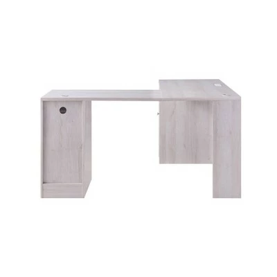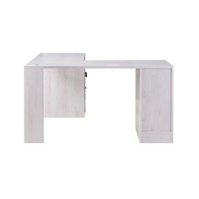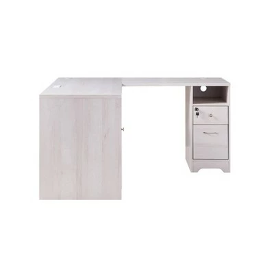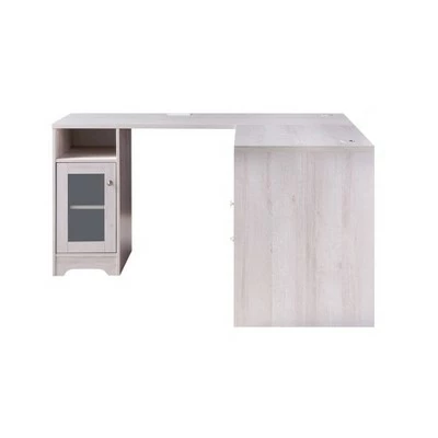 This transitional inspired L shaped desk contains two lockable drawers, one of which is for filing. It’s unique design also houses 2-open shelves and a cabinet with a frosted glass door. It comes equipped with 2-modern desk grommets for wire organizing, 1-built-in outlet and two USB ports. The toe kick bracket feet, trimmed knobs and beveled curve bar handle are finishing touches to the modern rustic desk. Choose between a Distressed gray or White Oak finish.