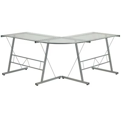 - Stage the perfect setting in your office with this stylish and affordable glass l-shaped desk. Boosting a large work surface to accommodate your laptop or desktop and an open design for a modern setting.