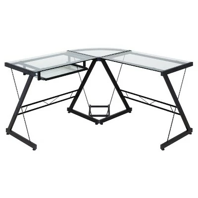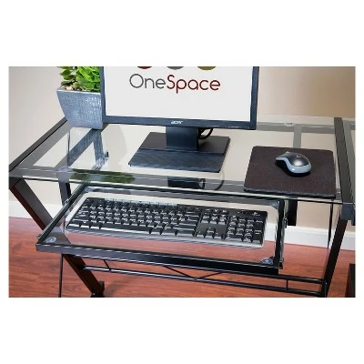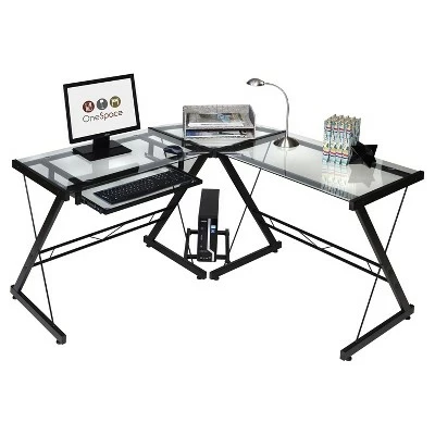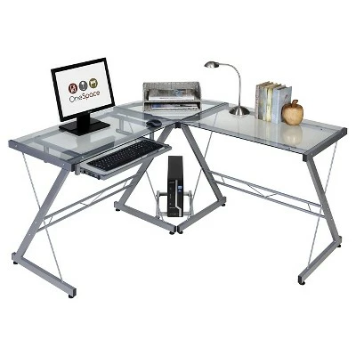 This L-shape desk is a welcome reality for busy days spent in the virtual world. Or any multitask your world requires. Ideal for corner placement, the three-piece glass desktop provides ample room for upping the productivity level. The handy pullout glass tray fits any keyboard, and it comes with a universal CPU stand that fits seamlessly underneath. The sturdy steel frame is designed to last through several computer upgrades. Ultra-sleek, ultra-stylish, and ultra-functional, this ultramodern glass L-shape desk represents the ultimate in space-saving value. Offered by One Space, part of the Comfort Products family. With a history dating back to 1919, Comfort Products specializes in affordable brands for better living.