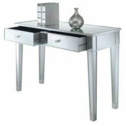 The classy yet contemporary styling of the Gold Coast Mirrored Desk Vanity will bring new life to any space. The glass mirror inlay pairs perfectly with the fir wood base. The faux crystal drawer pulls bring the look together giving you access to the two drawers providing concealed storage. Look for other pieces from the Gold Coast Collection sold separately.