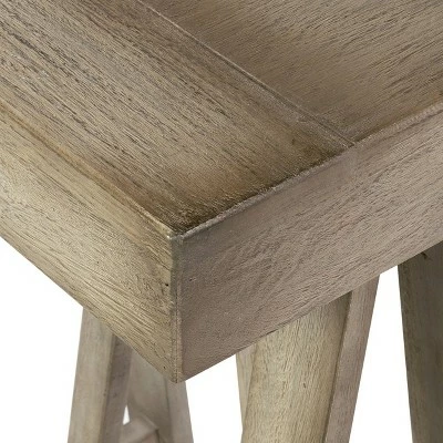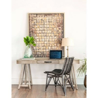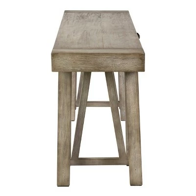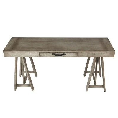 Tailor-made for any home office, our writing desk embodies a contemporary look without sacrificing functionality. Handcrafted in Indonesia from Mahogany, the beautiful medium brown wood with a delicate gray wash. a leather strap drawer pull, and sawhorse legs complete this clean look. With a narrow silhouette of 19″ D, it offers plenty of areas to set a monitor or laptop on, without compromising too much of your room’s space.