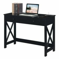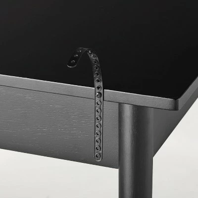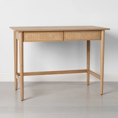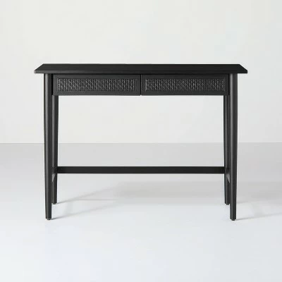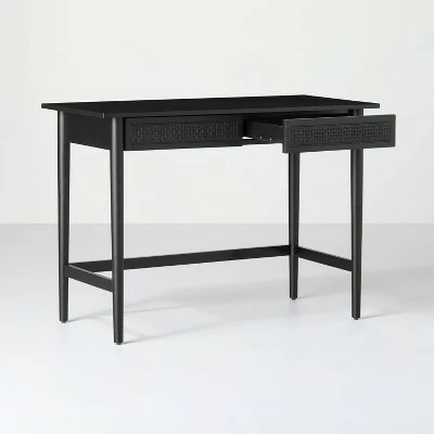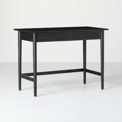 Furnish your workspace in style with this Wood & Cane Writing Desk from Hearth & Hand™ with Magnolia. Crafted from solid wood in a stylish black finish, this writing desk features a spacious surface for your laptop and lamp, while the can detailing lends eye-catching appeal to your work space or study area. The writing desk features two cane drawers where you can store important papers, writing utensils and other office supplies while keeping them within close reach. Simply add an upholstered chair with this wooden desk to work in absolute comfort.