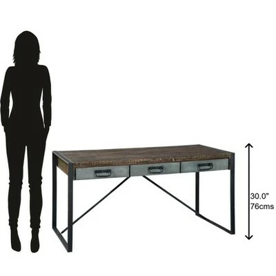 - Industrial-style desk of rough-sawn acacia with iron framework base.