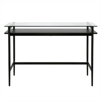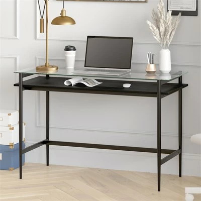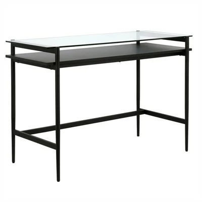 Work from home in mid-century style with this modern desk. The sleek lines of its steel frame are offset by a sturdy tempered glass top, allowing you a clear view to the woodgrained shelf below. Its open lower space provides plenty of room to settle in and take on the day. Go contemporary in Black Bronze or glam in golden brass to elevate your home office, game room, or vanity area.Features : Hand crafted Black Bronze finish is applied to the steel frame.Features a durable tempered glass top and black woodgrain shelf.The desktop has a weight capacity of 40 lbs. while the lower shelf can support 15 lbs.Desk features open lower space with wraparound crossbar.Features easy assembly.Clean with a soft, dry cloth; no harsh chemicals or abrasive cleaning materials.Specifications : Product Weight : 49.40 lbs