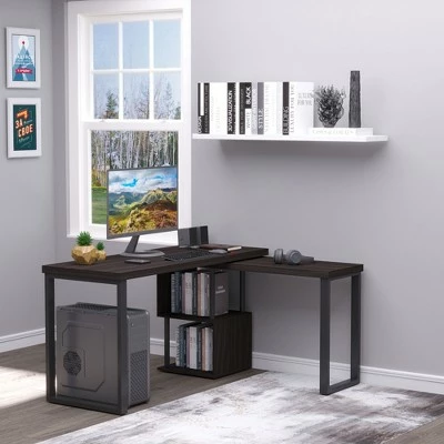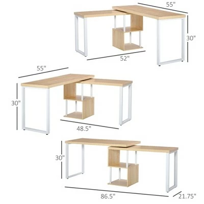 The HomCom L-shaped computer desk features an original 360-degree rotating design that can be adjusted to your needs and contains plenty of storage space. The modern look if this office desk adds a touch of class to your office or home and is crafted from high-grade materials. The multi-tier shelving of this home desk provides ample storage space. Create a stylish working station, storage unit, and display case in one with this unique L-shaped desk from HomCom.