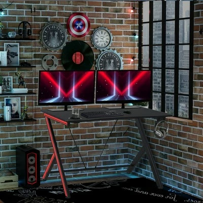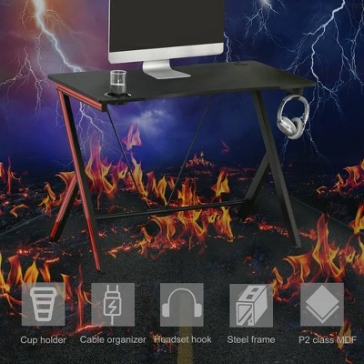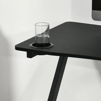 Attention to detail wins games, and trust that this ergonomic gaming desk is built to win. Our HomCom Computer Desk features a large monitor surface for placing all of your hardware. This office desk features built-in support for all your gaming hardware, providing solutions for your headphones, speakers, and drinks. This home desk table can seamlessly take you from workstation to a battle station.