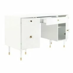 Refresh and renew any home office with this luxurious desk. Its contemporary spin on a classic style was designed with meticulously crafted smooth bright white wood and radiant gold and brass finishes on its chic hardware. Keep your personal belongings neat and tidy with the ample storage or decorate to your full desire atop the smooth flat desk. There will be sure to still have room for space to work. with soft closing drawers, it is a design investment.